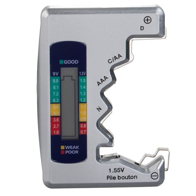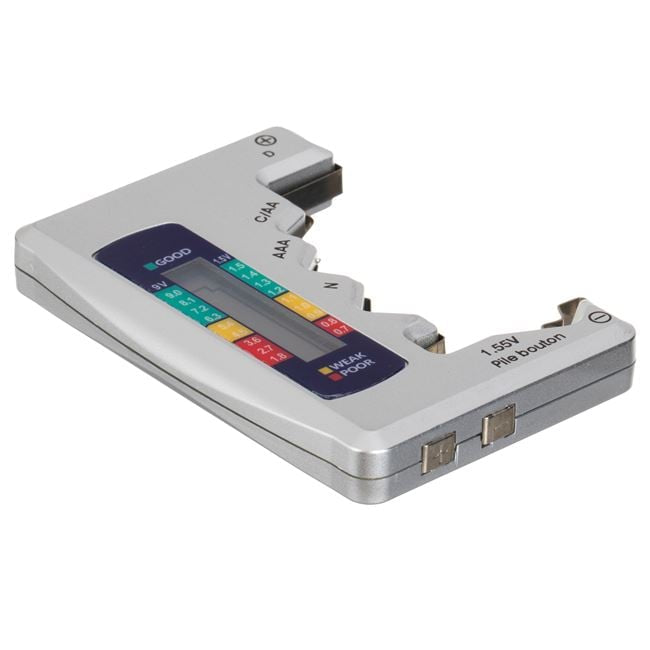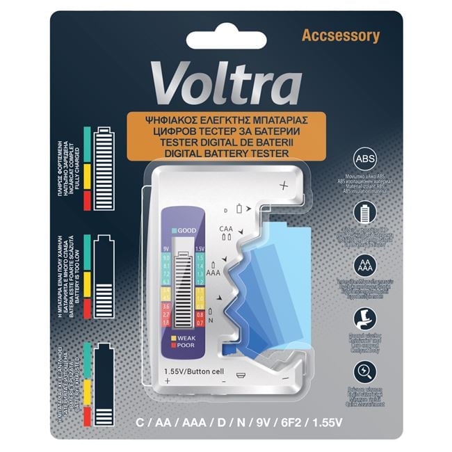Dispozitiv pentru verificarea tensiunii bateriilor. Realizat din material izolator ABS, cu afisaj LCD, are dimensiune portabila practica pentru masurare rapida si suporta mai multe tipuri de baterii (N, AAA, C/AA, D, 96V, 6F2).